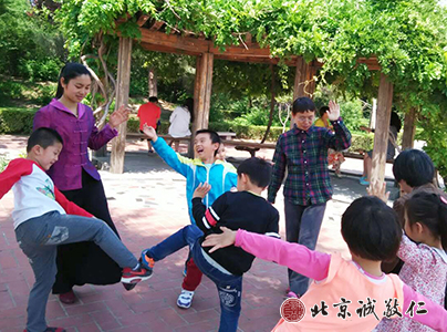 優(yōu)優(yōu)說:「我們玩『鉆山洞』的游戲,你們兩位老師手拉手把胳膊舉起來,我們小朋友就鉆過去。」
