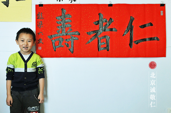 通過半年全天書法教室的學(xué)習(xí),劉同學(xué)的進(jìn)步是很顯著的,從寫筆畫的練習(xí),直躍到字體的書寫,等到年節(jié)時已經(jīng)可以在紅紙上寫作品了。今年回老家,直接在裁好的紅紙上寫「福」字。因?yàn)楹⒆幽昙o(jì)小,大人們聽說他寫「?!棺?,都饒有興致的來看??吹胶⒆訑]起袖子鄭重其事寫字的樣子,真是又可笑又認(rèn)真的場景。有大人說,先別說字寫的怎么樣,看他拿筆的架勢,好像就很會寫的勁頭哪。字寫出來確實(shí)很端正。