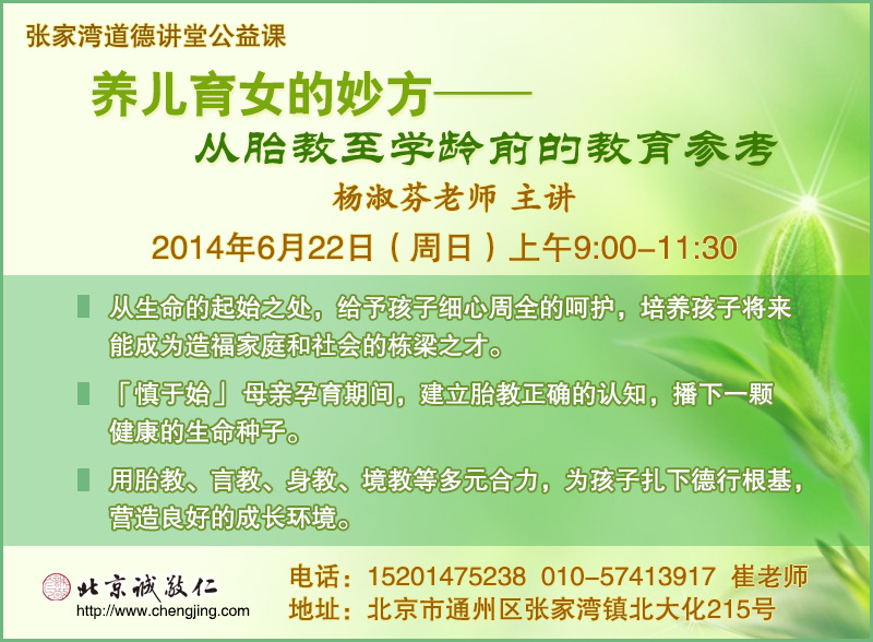 歡迎大家廣泛告知親朋好友,以及歡迎未婚青年男女先聽先學,積極參與此次意義深遠的學習——2014年6月22日,楊淑芬老師在北京誠敬仁主講的公益課《養兒育女的妙方——從胎教至學齡前的教育參考》。
