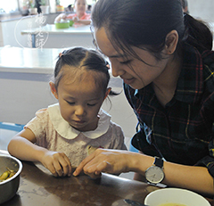 “你看,碗放得東倒西歪,勺子杵在一邊,這樣它們會難受的。我們把大一點的碗放在下面,小一點的放在上面,再把勺子平放在餐袋里。這樣它們就舒服多了。”