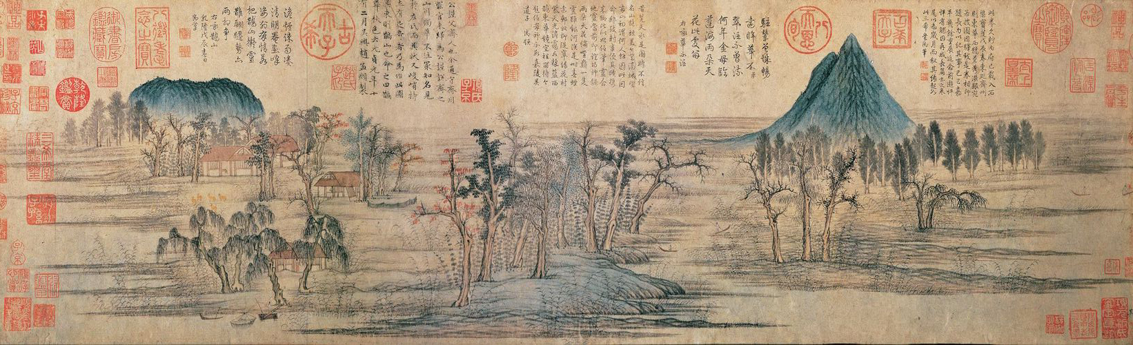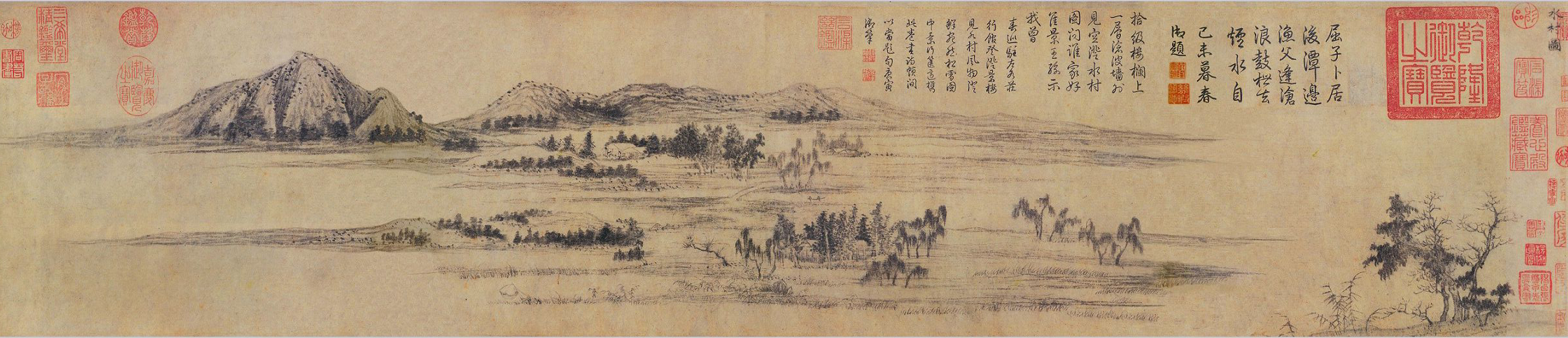 此畫是元貞元年趙孟頫自濟(jì)南路職位南返后,為友人周密描繪其祖籍地貌景色之作。