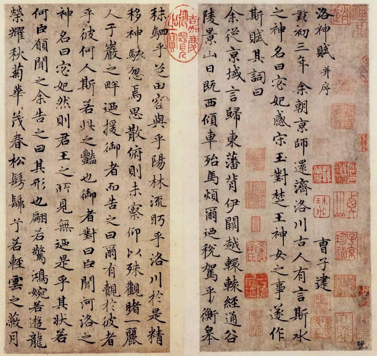 趙孟頫的傳世書跡較多,有《洛神賦》、《道德經(jīng)》、《膽巴碑》、《玄妙觀重修三門記》、《臨黃庭經(jīng)》、獨(dú)孤本《蘭亭十一跋》、《四體千字文》等。傳世畫跡有大德七年(1303年)作《重江疊嶂圖》卷、元貞元年(1295年)作《鵲華秋色》卷,圖錄于《故宮名畫三百種》;皇慶元年(1312年)作《秋郊飲馬》卷,現(xiàn)藏故宮博物院。