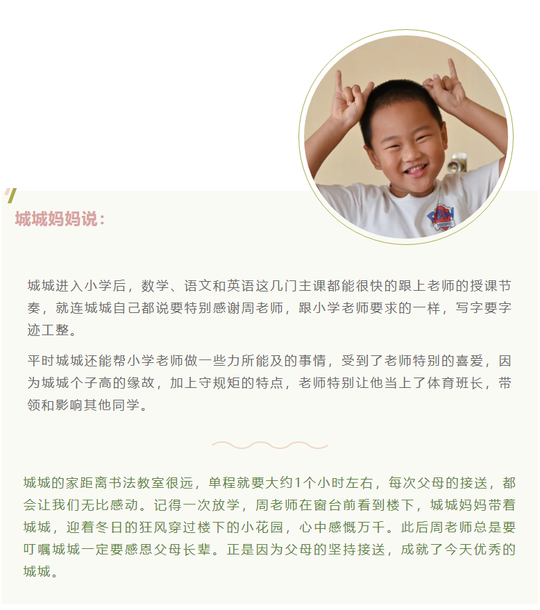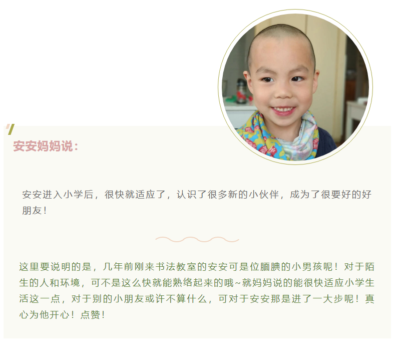 從中可以看到他的心在一點點的靜下來,專注起來,即使學前沒有過多的文化課補習,能夠掌握好的學習方法,和學習的好習慣,入學后仍然可以很快地跟上老師的教學進度,獨立完成作業,父母老師省心省力。