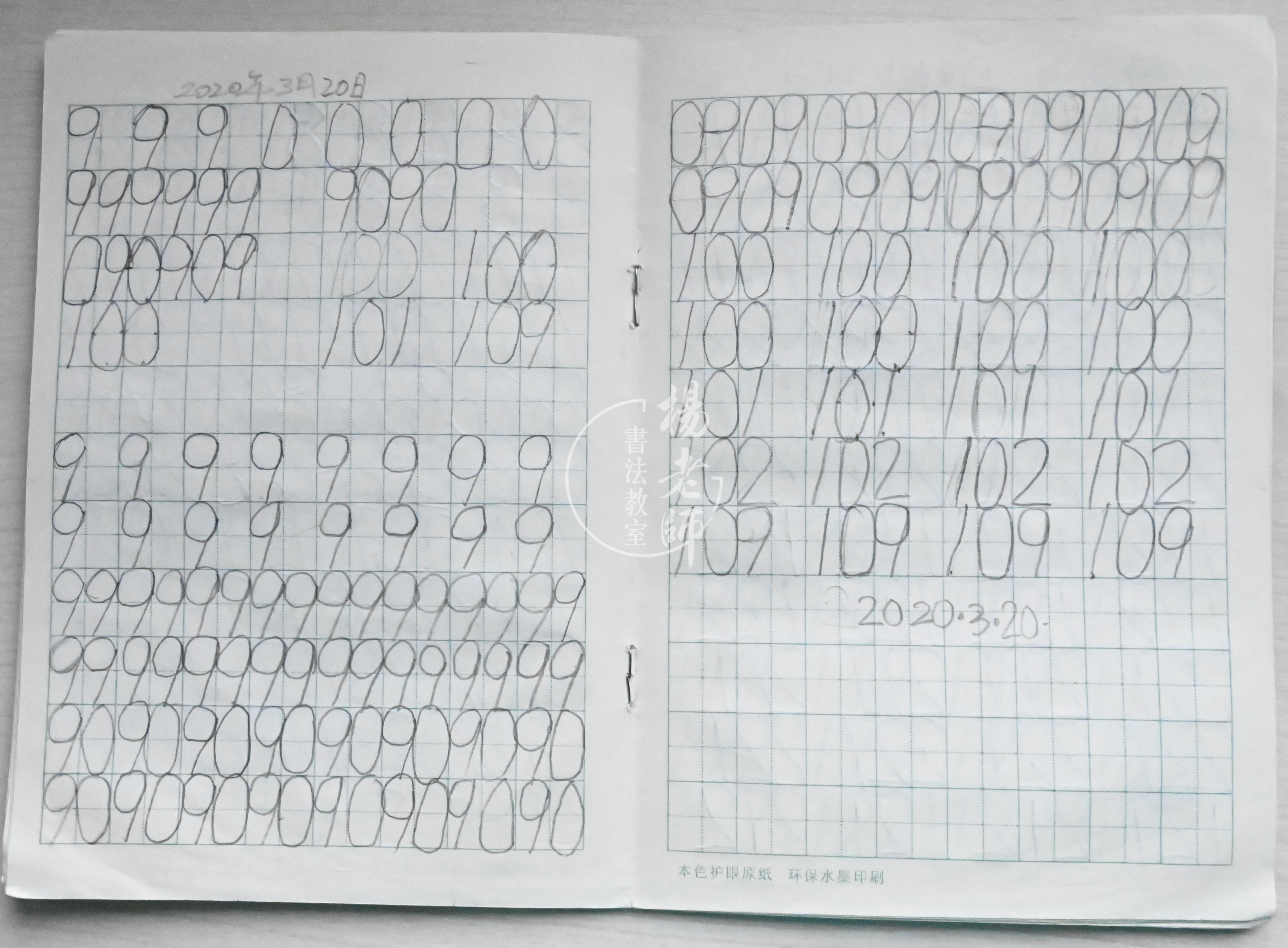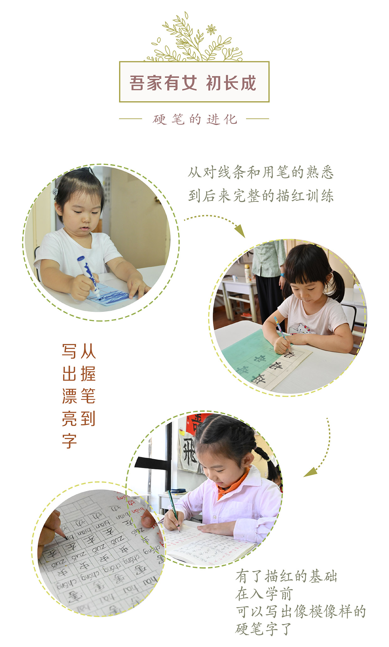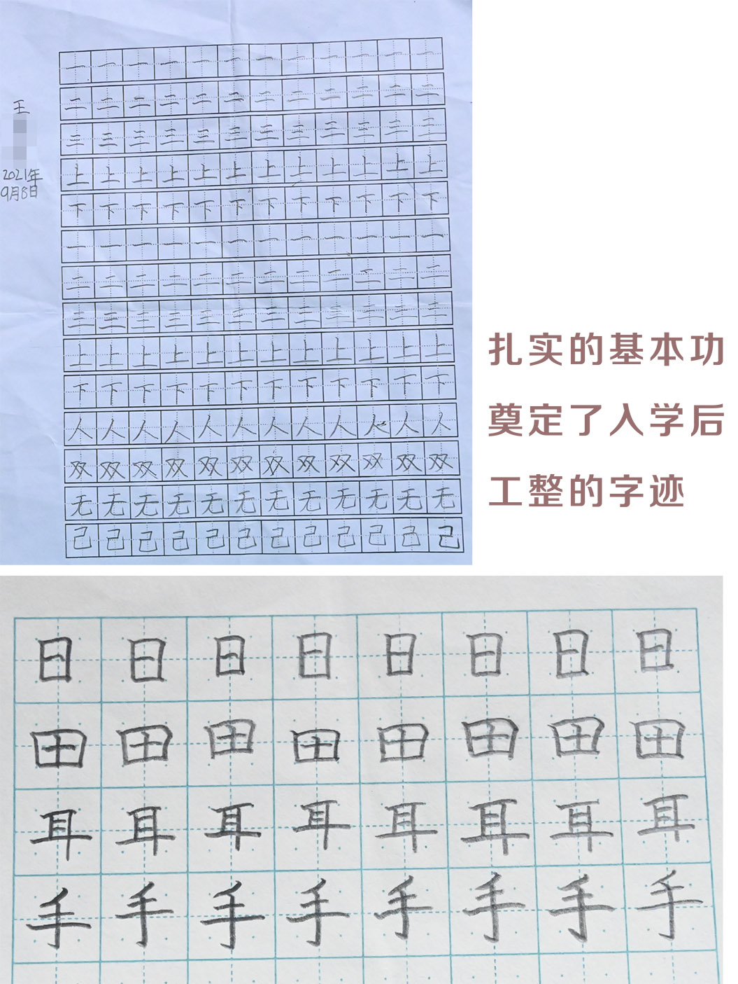 他的描紅從最初用筆的生疏,到線條的滯澀,再到后面有力而又勻稱的黑亮,結合書法字體結構的訓練,為入學前,字跡清晰工整的硬筆作業打下了扎實的功底。