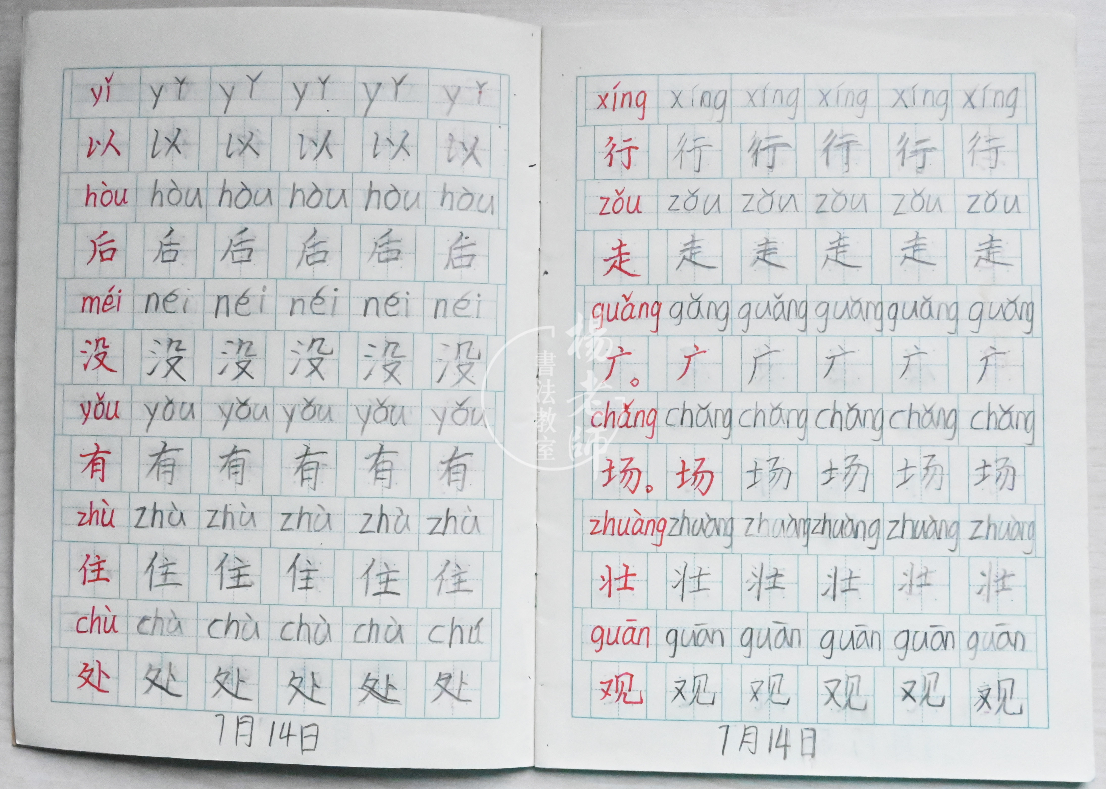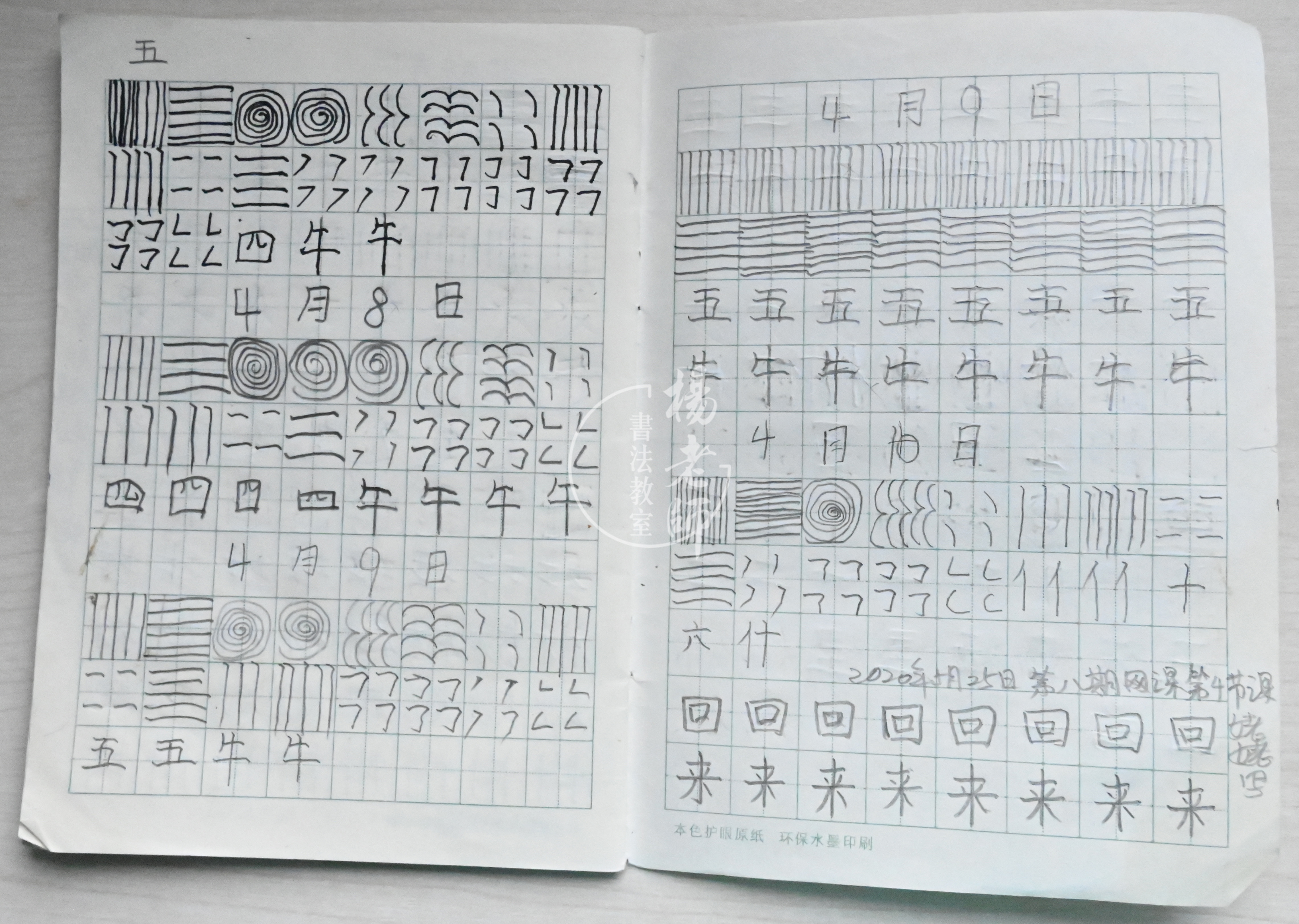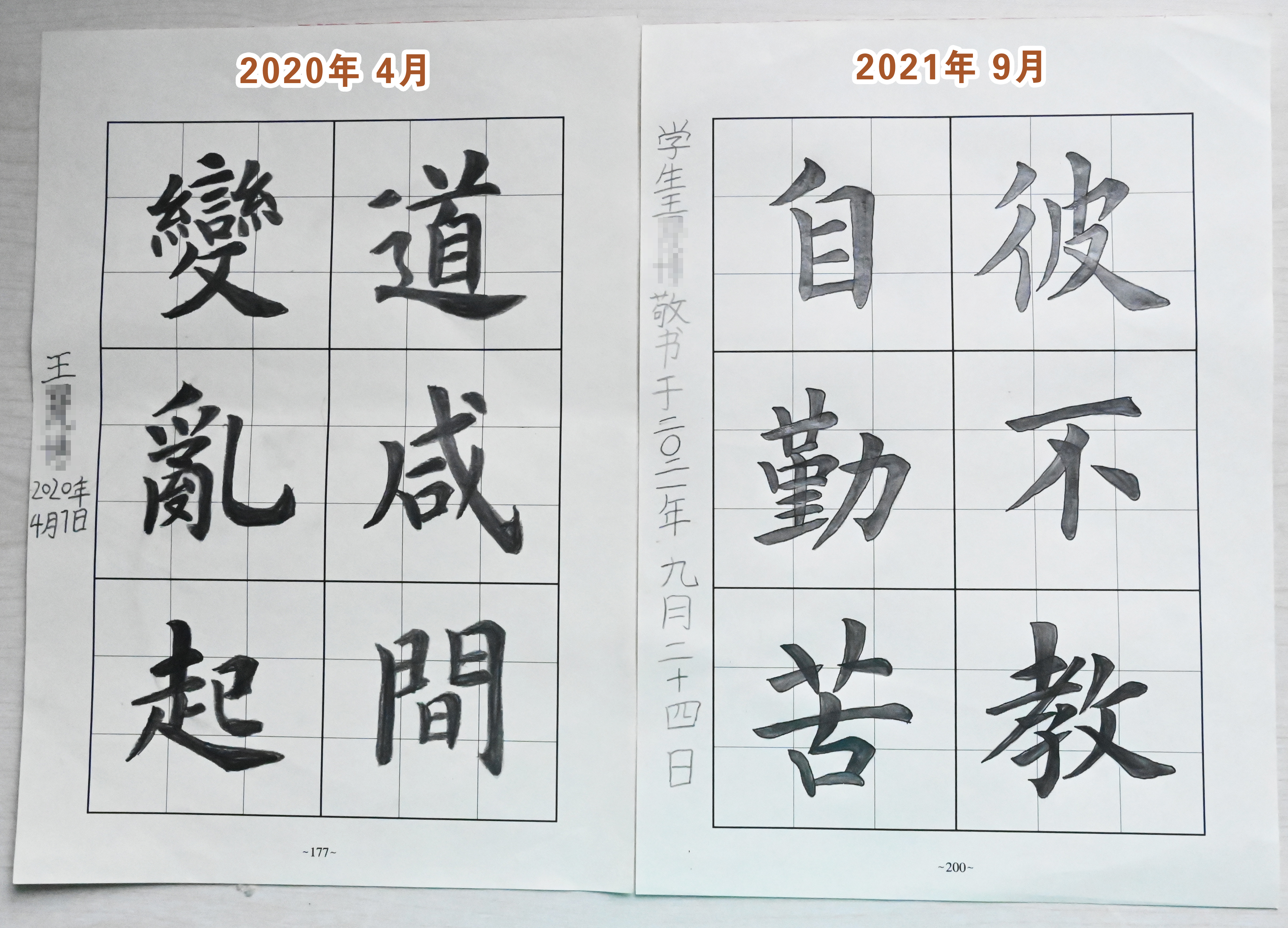 他的描紅從最初用筆的生疏,到線條的滯澀,再到后面有力而又勻稱的黑亮,結合書法字體結構的訓練,為入學前,字跡清晰工整的硬筆作業打下了扎實的功底。