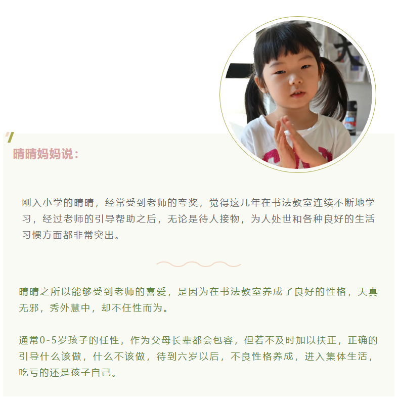 「楊老師書法教室」的老師們重視傳統文化扎根教育,注重將好的行為習慣融入到學習中,在課堂上遇到問題老師們會合力配合,甚至帶動其他同學營造正能量的氛圍來一同解決,起到事半功倍的效果。