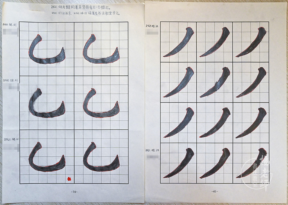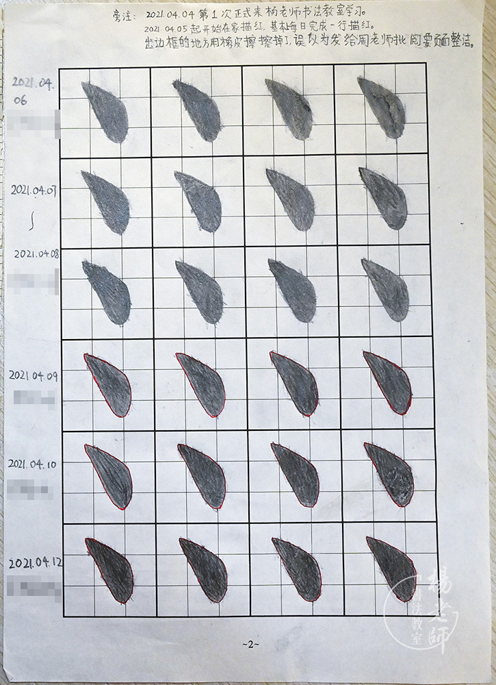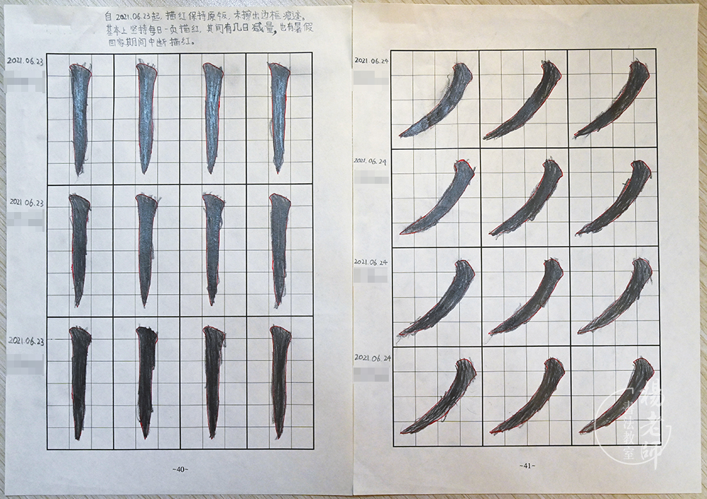 基本上堅持每日一頁描紅,其間有幾日減量,也有暑假回家其間中斷描紅。