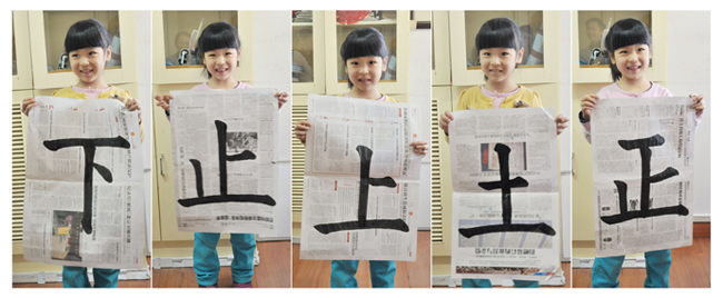 而現在呢?進步之大令人驚訝。有一次何老師到幼兒班看小朋友書寫,當時驊兒正在寫一個完整的「止」字。只見驊兒小手將毛筆握得穩穩的,心眼手合一皆凝聚在此刻書寫的字上,一筆豎下去,特別端直有力。那份專注認真的神情,旁人都能感受得到!