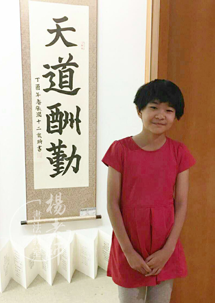 12歲的張同學,習書一年半,通過每周堅持兩次課的學習,逐漸對書法有了濃厚的興趣,寫出的「天道酬勤」作品,在炎黃藝術館參展,更增加了學習的信心!