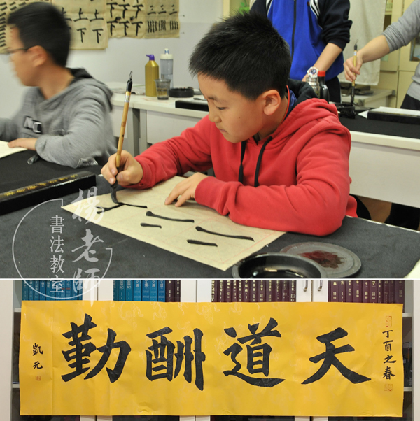 鄭同學因書法代表學校出訪阿聯酋,現場寫出了「福」字,并用英語解釋「福」的含義,得到「?!棺值膶W生非常地高興。他回校后因學業原因,書法擱置了一段時間,但因功底扎實,功力并未大減,再拿起筆后沒多久就寫出了「天道酬勤」掛在了教室,成為全班的座右銘。