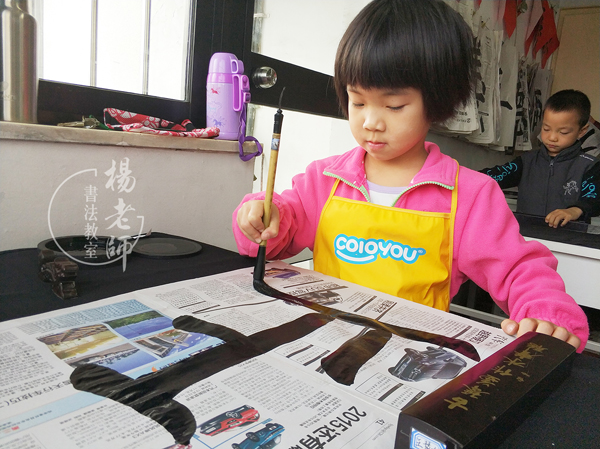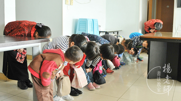 「楊老師書法教室」的孩子們從每天剛剛進門開始,就要學會主動與老師們問好,再向長輩感謝、再見。往往剛入學的孩子很不習慣行鞠躬禮,小小的腰背和頭總是很難彎下去,老師會耐心的一次又一次的反復演示指導,直到動作做規范了方可過關。因為有了老師這樣嚴謹而認真的態度,再到以后的要求中,孩子們就會多了一份認真對待。