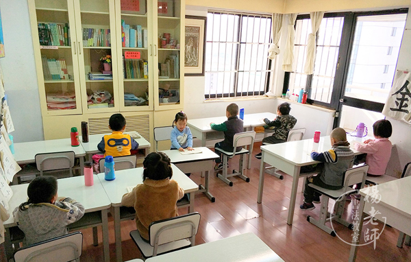 剛來書法教室的孩子還不習慣行鞠躬禮,每當大家都莊嚴肅立時,他總是東躲西藏,非要老師拽著他,才能安定,老師看著他的眼睛嚴肅地說:“要做對的事,我們一起向夫子爺爺鞠躬,請求夫子爺爺幫助我們成長。”經過一星期的訓練,他終于可以超常發揮,安定地行禮了。