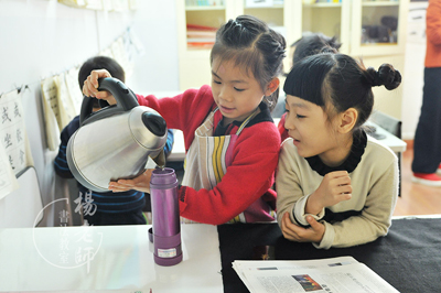 習練書法時,有孩子用毛筆噙起水珠在水寫帛上玩滴水游戲,老師教導他:“水資源很寶貴,快把小水珠救回硯臺,好孩子,不能浪費水。”孩子接著問:“浪費水會怎么樣?”老師鄭重其事地說:“浪費水,以后就沒有水用了,想想看,后果多嚴重。”老師還發現這位孩子把紙巾搓成小團泡在硯臺里,老師接著引導他:“紙巾是用很多樹木做成的,要珍惜,如果樹木都被砍光了,就沒有美麗的森林了,想想看,沒有綠色的葉子,世界多枯燥啊。”孩子的內心被觸動了,他熱愛美麗的森林,應當愛惜每一張紙。