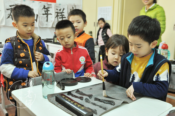 習(xí)練書法時(shí),小石頭沒(méi)有抓緊時(shí)間,老師叮嚀道:“你不應(yīng)該在此浪費(fèi)時(shí)間,以少為足,看看同學(xué)們都那么認(rèn)真,你是不是也應(yīng)該好好努力?”小石頭懂事地點(diǎn)點(diǎn)頭,開(kāi)始認(rèn)真書寫。復(fù)習(xí)完基本筆畫,小石頭正寫到“二”字,還寫得歪歪扭扭就打算往下學(xué)新的,老師義正言辭地說(shuō):“學(xué)過(guò)的字還沒(méi)學(xué)扎實(shí),不往下學(xué)。學(xué)一樣就要像一樣,規(guī)規(guī)矩矩的才行。”老師指著范字對(duì)小石頭說(shuō):“你要好好地觀察,楷書是比例協(xié)調(diào)的,就像我們的眉毛、眼睛、鼻子、嘴巴有各自的位置和協(xié)調(diào)的比例。”小石頭聽(tīng)了老師生動(dòng)的比喻,耳目一新,加足馬力。當(dāng)“調(diào)皮軍隊(duì)”又來(lái)干擾他時(shí),老師督導(dǎo)他:“提起正氣!要像自己的姓氏一樣優(yōu)秀,做龍的傳人!”他挺起胸膛,瞬間充滿電,能量豐沛。