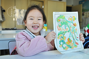 女兒在家并不熱衷于彩繪,安排她彩繪,畫一會就不感興趣了。一天,寫完描紅作業,她繪了幾筆就坐不住了。我故意說:“我最喜歡彩繪,讓你看看媽媽是怎么給它們穿上漂亮衣服的。”我認真地彩繪并不關注她。