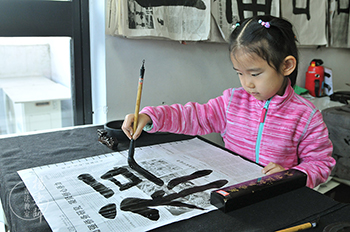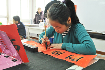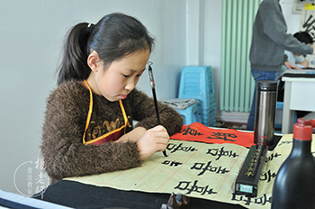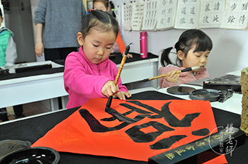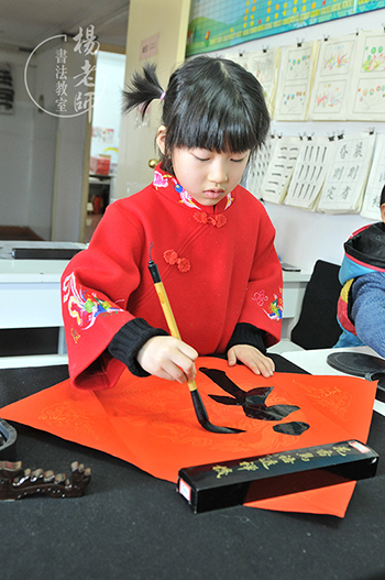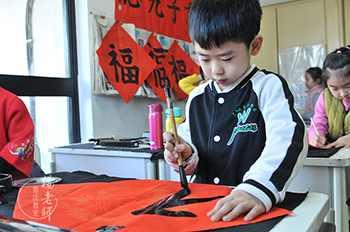 孩子們卯足了勁,將積淀了一年的功力書寫于紅紙上,毛筆在充滿專注與力量的小手下,呈現出一張張渾厚圓潤的「福」字。