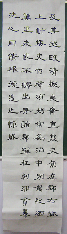 徐老師大概用站樁懸腕的方式練習了一年的基本功之后,開始枕腕練習楷書,手完全不疼了,而且寫出來的字比原來的有大幅度的提升。徐老師參加誠敬杯書法比賽,順利進入復賽。寒假期間,徐老師開始臨摹隸書《曹全碑》,發現自己很快就掌握隸書的基本筆法,而且越寫越有信心。