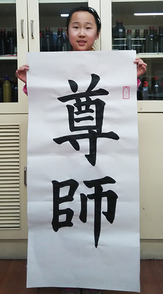 2. 書法的學習首重基本功, 這是一個循序漸進,慢慢熏習的過程。書法的學習首重基本功,也即基本筆畫的練習越扎實,往后的進步就會越快,一開始好似比別人慢一些,但是兩三年后就能,基本功扎實的同學,他們寫出的字是有區別的,尤其在字的力道方面,基本功扎實的同學,寫出的字會比較耐看。比如孟凡竣,孫米陽、嚴子恒,彭欣祺等,他們幾位同學是從幼兒班扎根,2015年10月份后才升級到誠敬班的,孫米陽同學是2016年1月升級到誠敬班的,這幾位同學因為在小班有過至少一年的時間學習,不論是禮儀還是書寫的規矩和基本功都比較扎實。