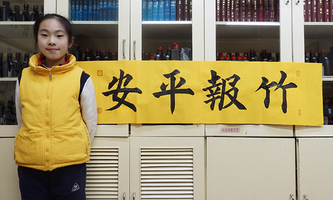 周同學今年17歲,上高一,是馬來西亞華裔。她是一個非常孝順的孩子,在學習之余,懂得體貼照顧媽媽,減輕媽媽的工作負擔。2012年12月開始學習書法,兩年基本功扎根之后,進步更快。2015年2月參加北京市書法節比賽,獲得提名獎,2016年元旦參加北京誠敬仁公司書法比賽決賽,獲得三等獎。
